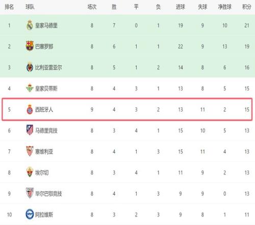 本场过后,西班牙人在前9轮西甲,已经足足拿到15分。在目前的积分榜上,他们多赛一场,积分已经追平了第四的贝蒂斯,排名上前五,甚至还领先马竞2分。本赛季,西班牙人已经成为西甲超级大黑马,如果能继续保持这样的抢分势头,他们随时有机会竞争一个欧战席位。