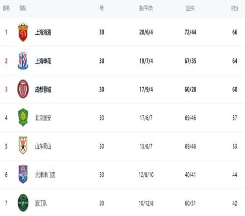 在积分榜上,上海海港66分夺得冠军。上海申花以64分排名第2。成都蓉城以60分排名第3。第4的是北京国安,拿到57分。山东泰山以53分,排名第5。第6的是天津津门虎,拿到44分。梅州客家21分排名倒数第2,长春亚泰以19分排名倒数第1。梅州客家和长春亚泰都降级了。