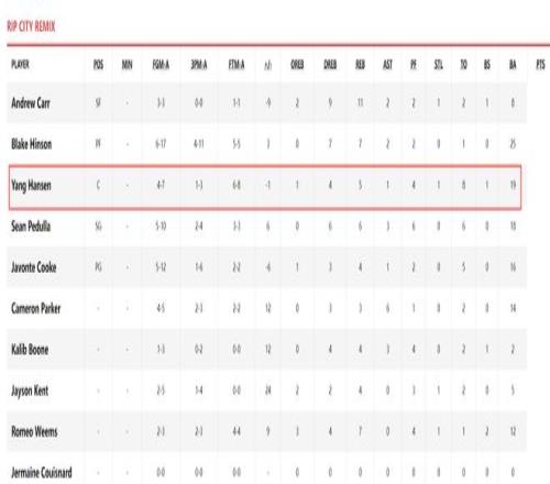 全场比赛小杨打了27分钟,这比之前的几场混音队比赛时间都少(都在30分钟左右),这说明混音主帅也知道杨瀚森疲劳,最终杨瀚森7中4,三分3中1,拿到19分5篮板1抢断1盖帽4犯规8失误,命中率57.1%,失误率、犯规率较高我认为是瑕不掩瑜的。