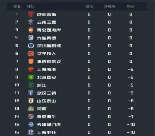 下赛季中超联赛在各支球队被罚分后的排名情况。