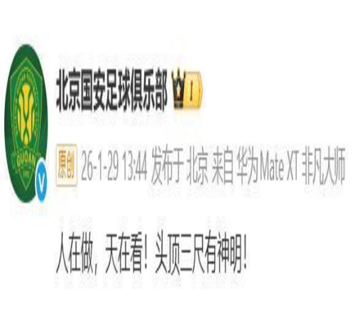 29日,在遭中国足协处罚后,北京国安足球俱乐部在官方微博发文:人在做,天在看!头顶三尺有神明!
