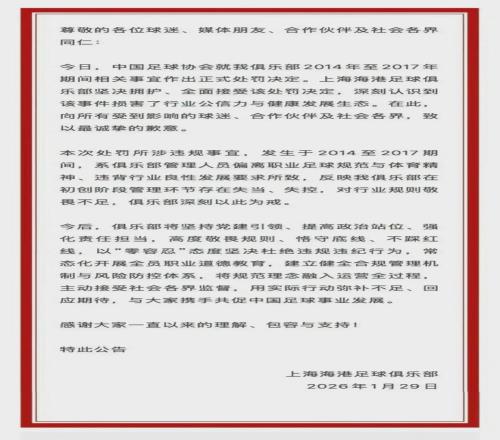 29日,上海海港足球俱乐部发布公告道歉:坚决拥护、全面接受处罚决定。