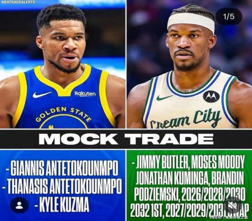 具体交易内容为:勇士得到字母哥+字母哥哥+凯尔库兹马,雄鹿则得到吉米巴特勒+摩西穆迪+乔纳森库明加+布兰丁波杰姆斯基+2026年、2028、2030、2032首轮签+2027、2029、2031首轮互换权。
