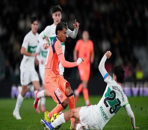 北京时间2月1日,西甲第22轮,巴塞罗那客场挑战埃尔切。比赛中。图源:视觉中国上半场第7分钟,奥尔莫中路直塞,亚马尔拿球长驱直入,晃开门将推射空门得手,巴塞罗那1-0埃尔切,第29分钟,阿